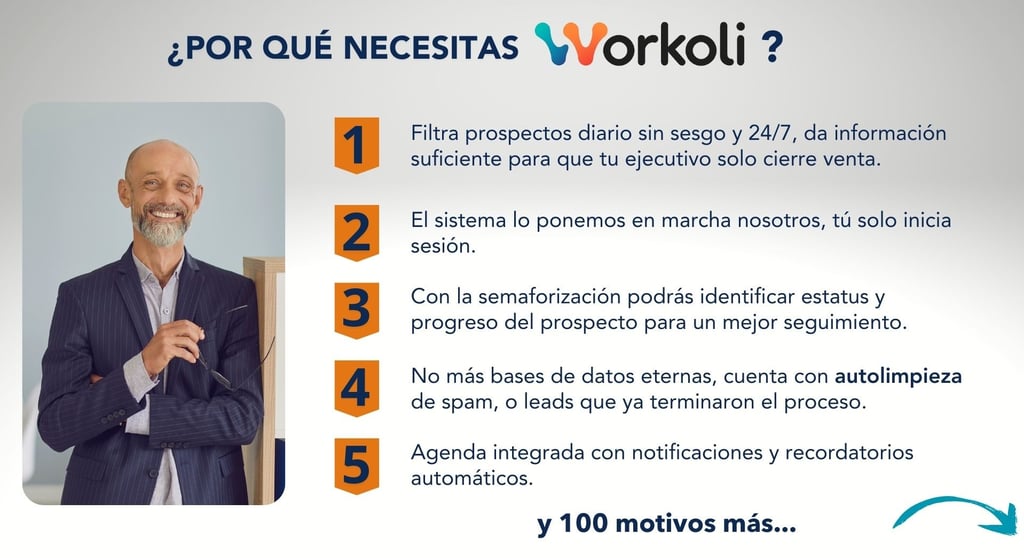 Workoli es más que un software, es un nuevo miembro de tu equipo. Un aliado digital que combina la potencia de un CRM inteligente y un Asistente IA especializado para conversar, calificar y organizar automáticamente a personas vía WhatsApp 24/7, adiós a las llamadas en frío y al whatsapp saturado.